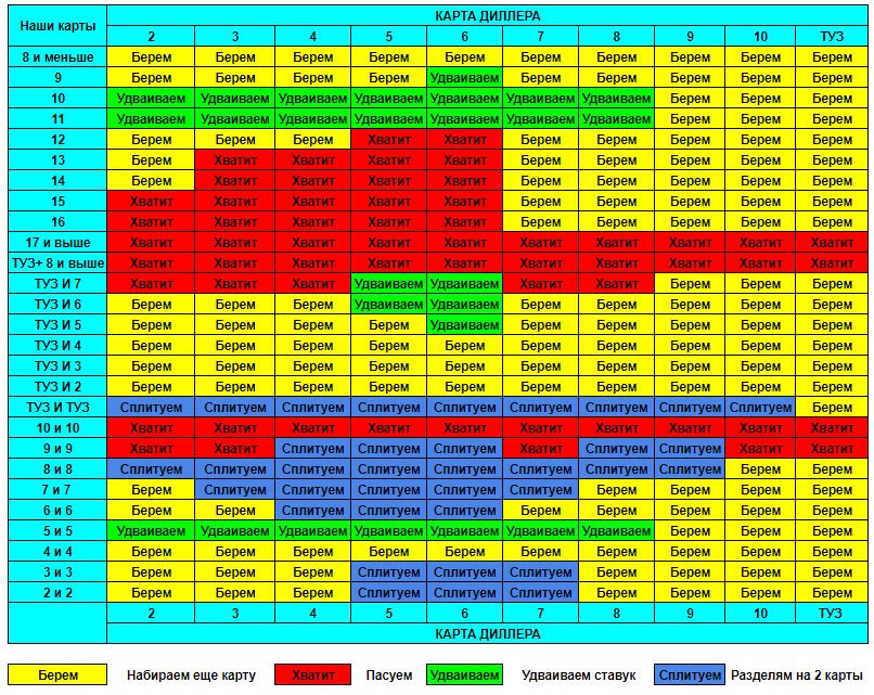 Если использовать базовую стратегию (БС БД), то возможность поражения можно свести к нулю, так как приблизительно полвека назад учёные просчитали решения, которые следует принимать при определённом раскладе карт. Итоги этих подсчётов можно наблюдать в таблице подобного типа: