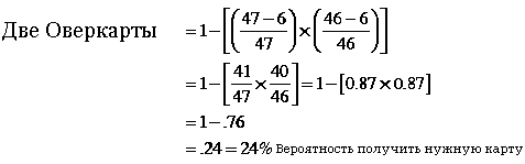 Возьмем для примера дро с двумя оверкартами, где для каждой из них есть по 3 аута. Иными словами, для вероятности составления топ-пары есть 6 аутов.