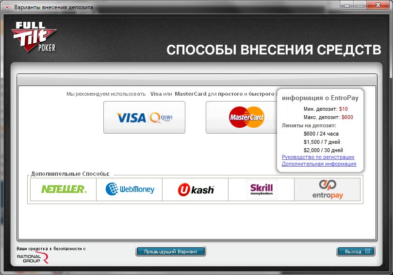 Система ввода/вывода также не осталась обделенной вниманием разработчиков программного обеспечения для Full Tilt Poker. Все процессы, будь то ввод или снятие денег с депозита, производятся в кратчайшие сроки. Это довольно приятная мелочь, учитывая то, что все операции производятся с одной скоростью как для игроков с минимальным депозитом, так и для больших сумм.