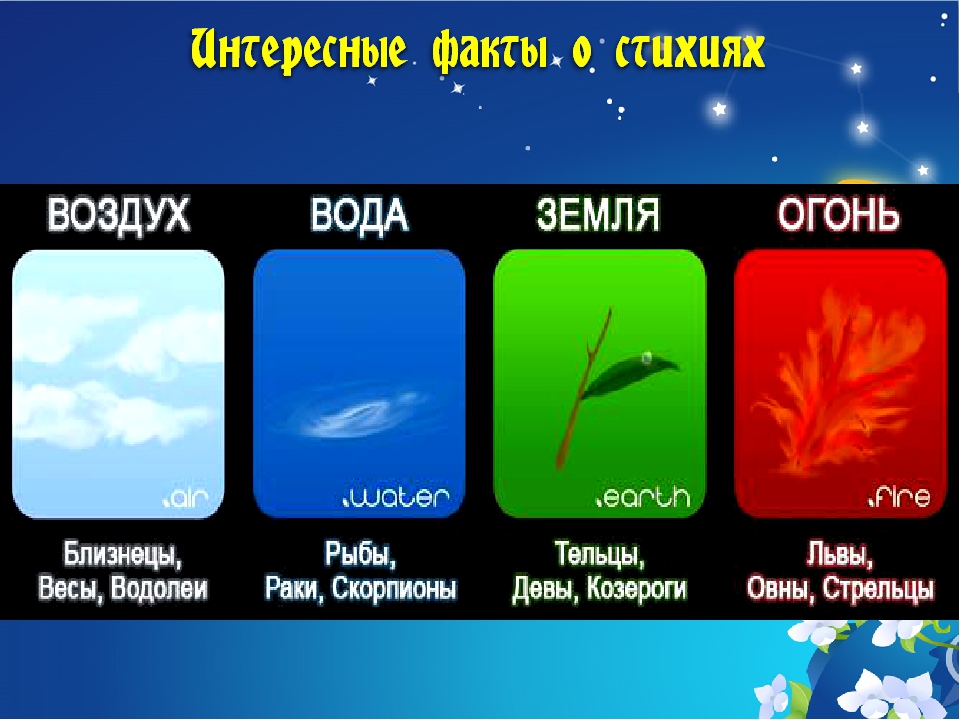 Известно, что четыре стихии – Огонь, Вода, Земля и Воздух – покровительствуют тем или иным знакам Зодиака.