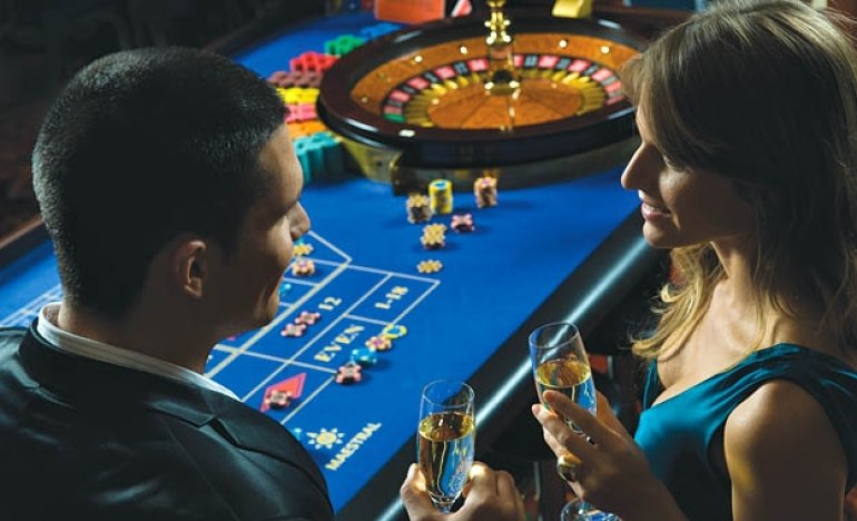 Влюбленная пара распивает шампанское перед игрой в рулетку