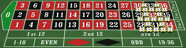 Потом нужно определить в какой линии мы зачеркнули большее количество чисел, и сделать одинаковые ставки на лишившиеся числа с этой линии.