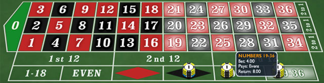 Сначала на все шансы нужно сделать ставку в размере восьми единиц. Представим, что выиграл номер двенадцать, который относится к «красному», «маленькому и «четному».
