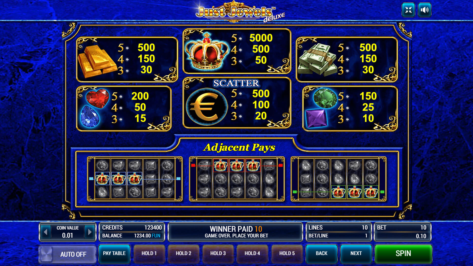 Автомат «Just Jewels Deluxe» предлагает десять игровых линий, число которых игрок может регулировать на свое усмотрение, а так же великолепную графику, звук и анимацию.
