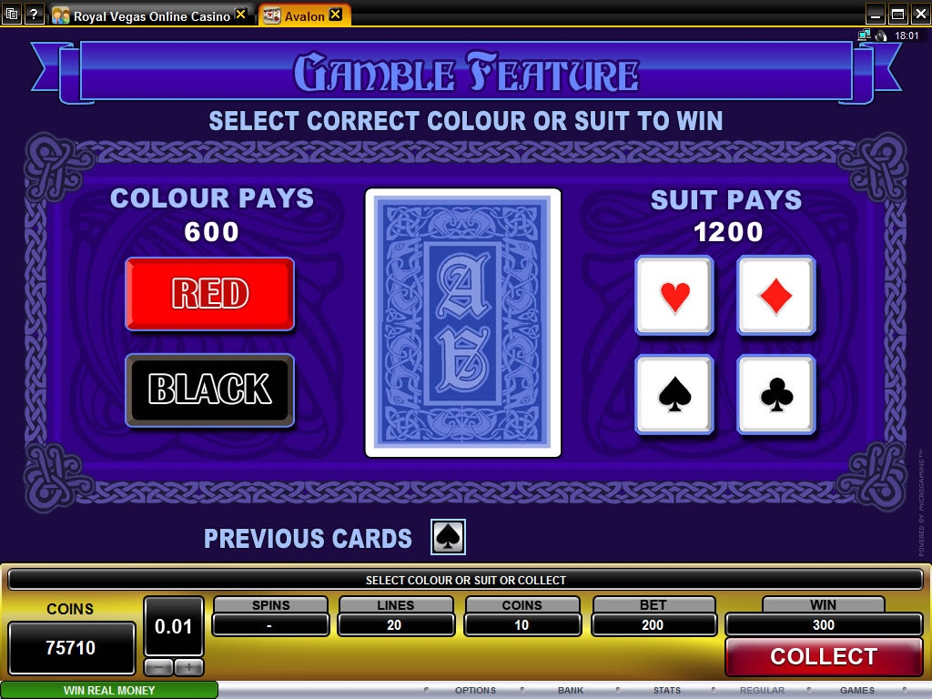 Как и в любом другом слоте, после каждой выигрышной комбинации в «Авалоне» можно стать участником бонусной игры на удвоение. Угадать здесь нужно сперва номинал игральной карты, а затем еще и ее масть – красная или черная. В первом раунде ставка игрока удвоится, а во втором увеличится в четыре раза. Чтоб не потерять выигрыш, можно будет остановиться после того как угадаешь номинал карты.