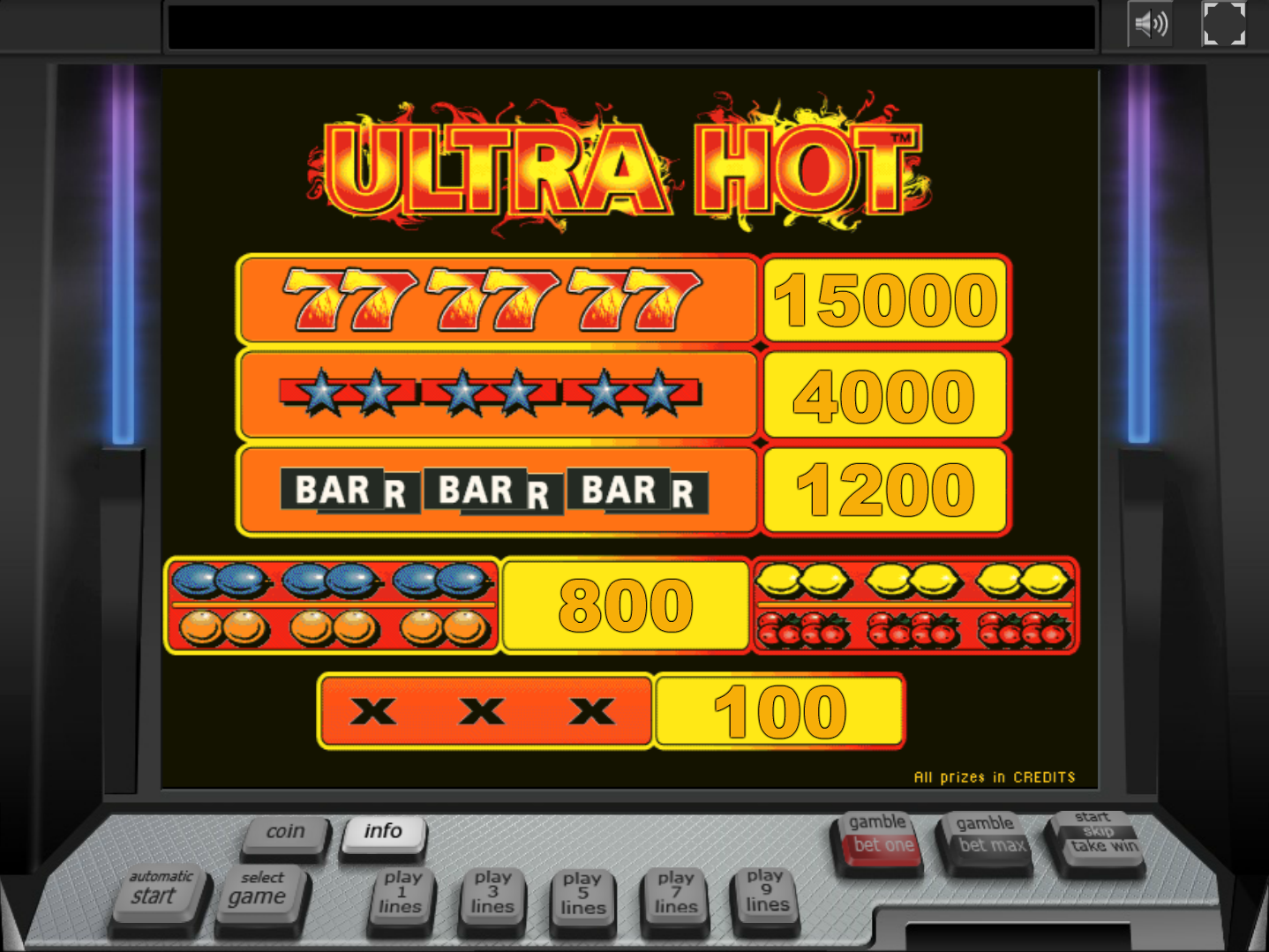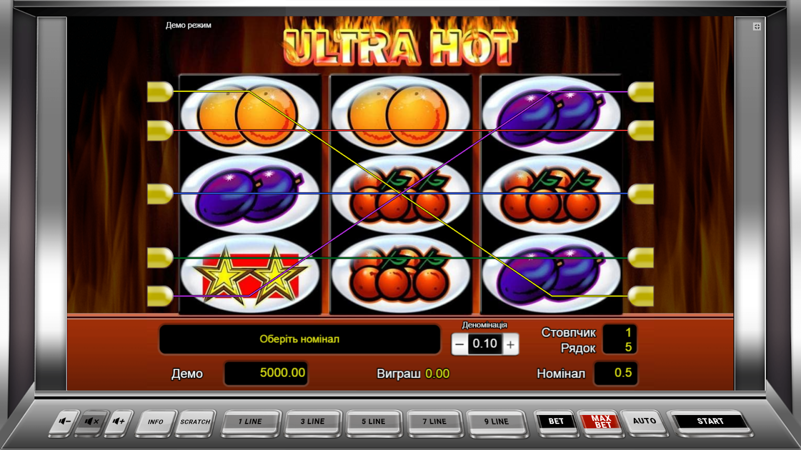 Игровой автомат Ultra Hot использует 8 символов. Самым дорогим из них является изображение цифры семь. Если на линии выплат появятся три таких значка, сумма выигрыша будет равна скорости линии, умноженной на 750 раз.