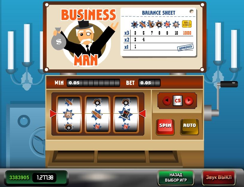 Игровой автомат «Бизнесмен» включает в себя три барабана, которые совершают свои движения без зависимости друг от друга по линии. Самая большая ставка здесь может равняться 10ти долларам. Не радует только то, что данный слот не имеет бонусных игр и возможности выбора игровой линии, хотя на популярность автомата это не особо влияет. Кстати, максимальный выигрыш, который способен выдать «Бизнесмен» может быть равен 100 тысячам «зеленых». Привлекательно, не так ли?