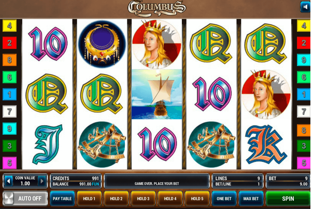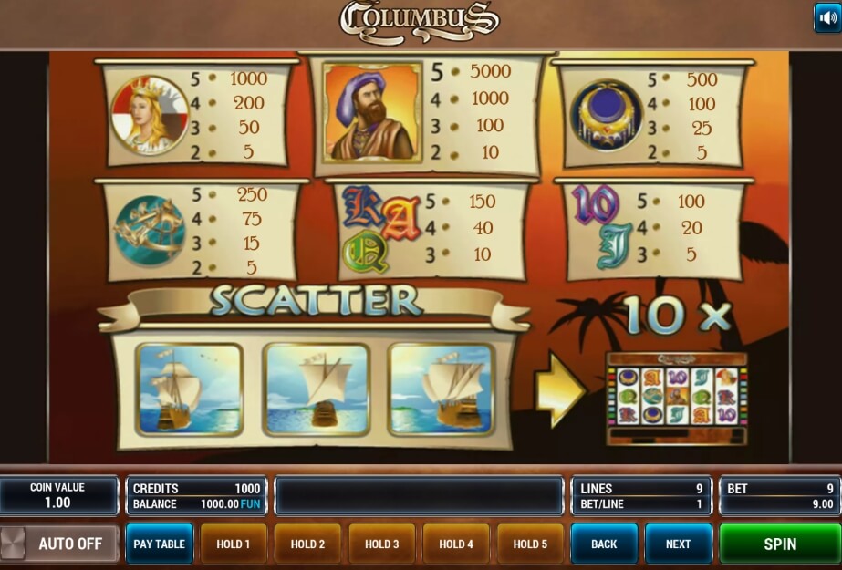 «Дикий» символ в роли Колумба может заменять любые другие, кроме бонусного. В таблице выплат нажав кнопку «Paytable» можно узнать полную информацию об остальных символах.