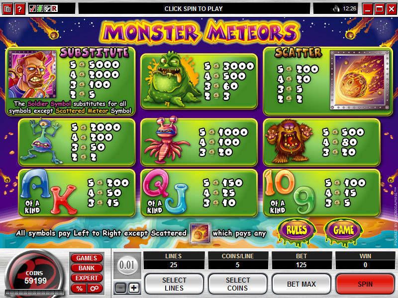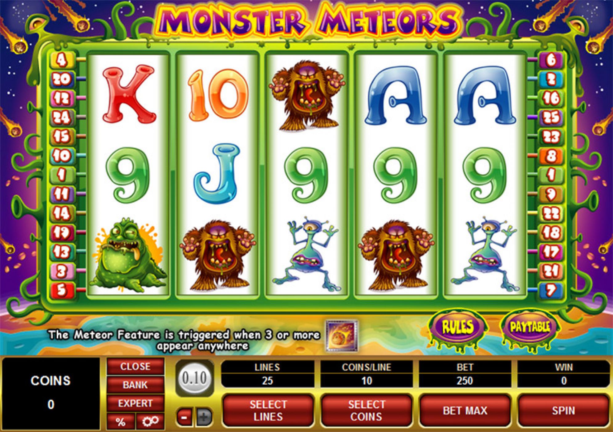 Производители игровых автоматов решили сделать «Monster Meteors» из 25 активными линиями. Здесь много ужасных монстров: красных и зеленых, глазастых и с длинными щупальцами. Все они имеют определенное вознаграждение, которое прилагается в таблице выплат.