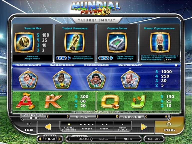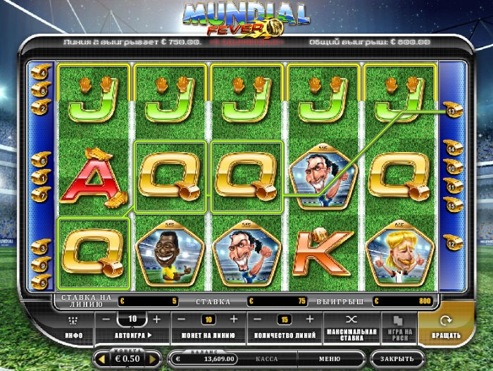 Автомат Mundial Fever содержит пять барабанов и пятнадцать игровых линий выплат.