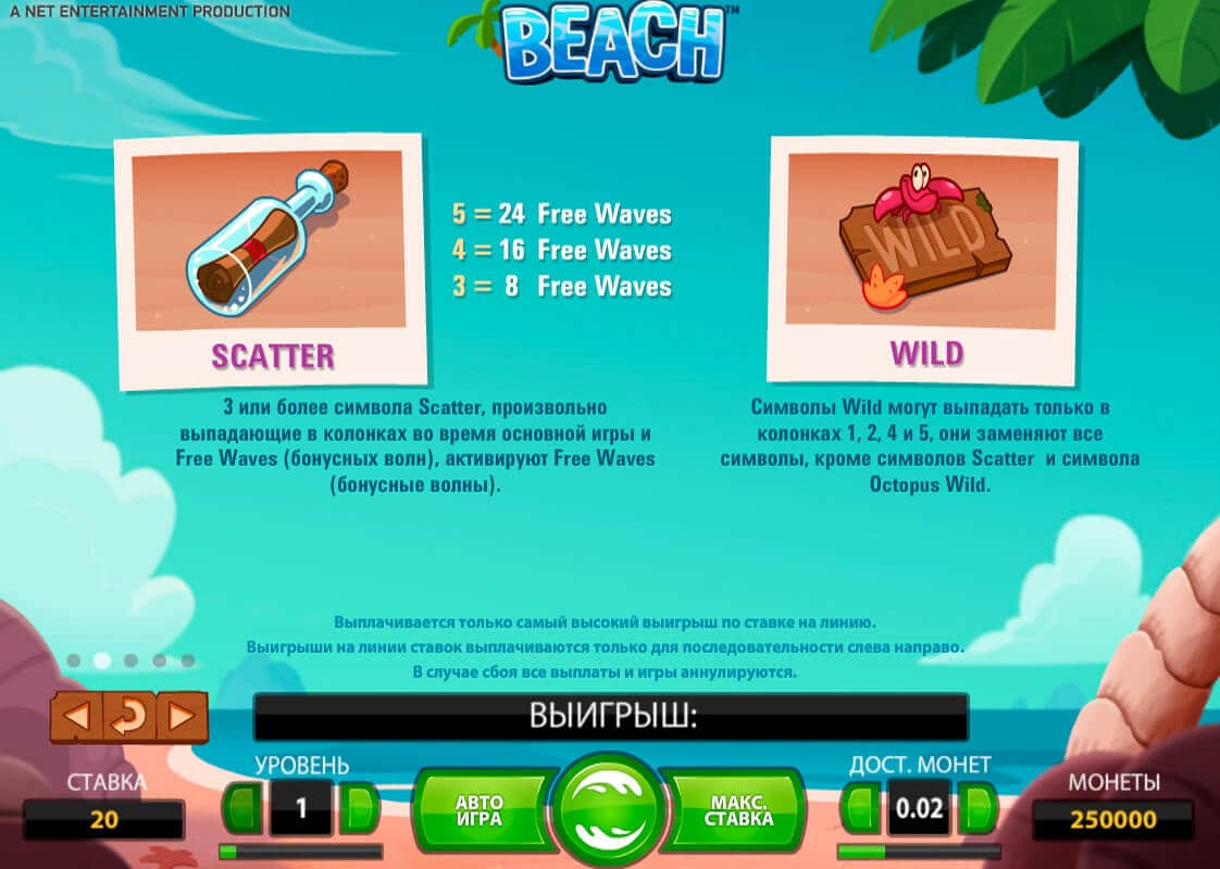 Волны могут принести на берег письмо, запечатанное в бутылку. Это письмо является скаттером слота «Пляж». При выпадении нескольких таких писем Вы станете обладателем бесплатного дополнительного вращения барабанов.