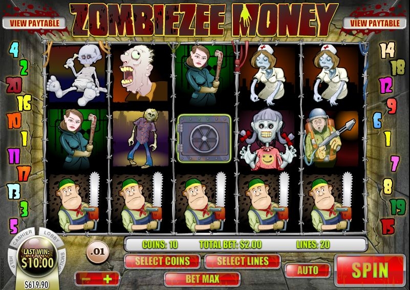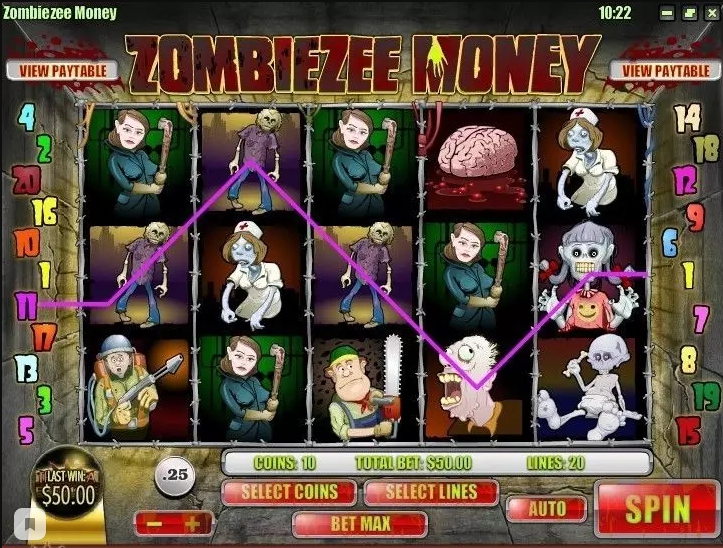 Зомби деньги – это видео слот со стандартным количеством активных линий (20), которые формируются с помощью пяти барабанов. Автомат оснащен парочкой бонусных раундов и различными специальными символами.