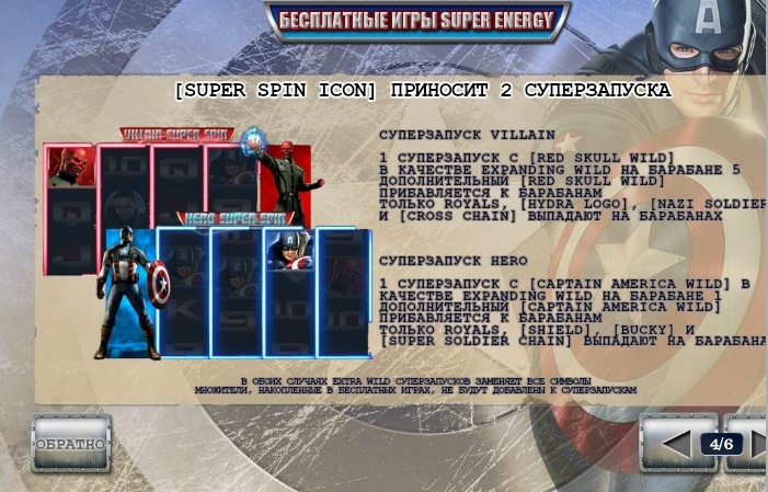 Изображения Капина Америка на первом барабане, или Красного Черепа на пятом барабане отправят вас в невероятное и завораживающее приключение бонусной игры.