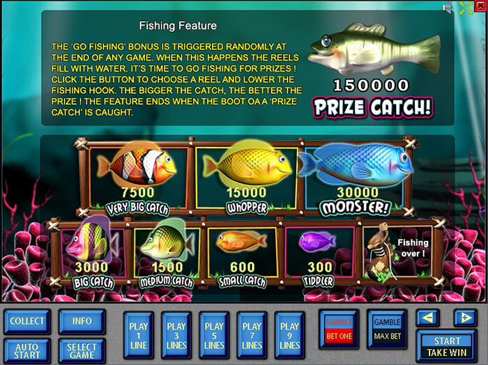 О начале такой бонусной игры вы сразу узнаете, экран заполнится водой, а в руках появится сразу пять удочек, с помощью которых нужно выловить большой куш. Окончанием игры станет улов старого, вонючего башмака.