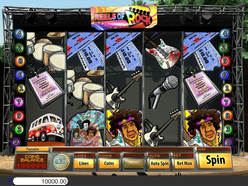 Игровой автомат Reels of Rock. Слот посвящен музыкантам шестидесятых. Во время игры звучит музыка Джимми Хендрикса, Дженнис Джоплин, Джима Моррисона.