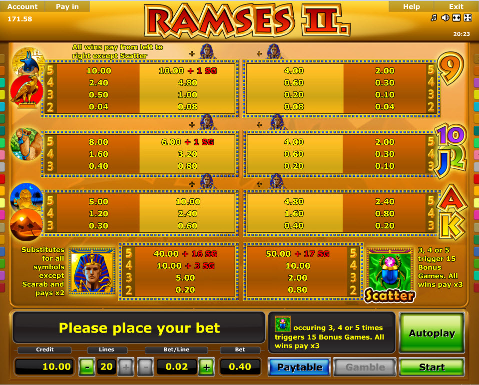 Символы Фараона и Скарабея являются наиболее дорогими символами, поскольку игровой автомат Ramses II посвящен древнеегипетской тематике.