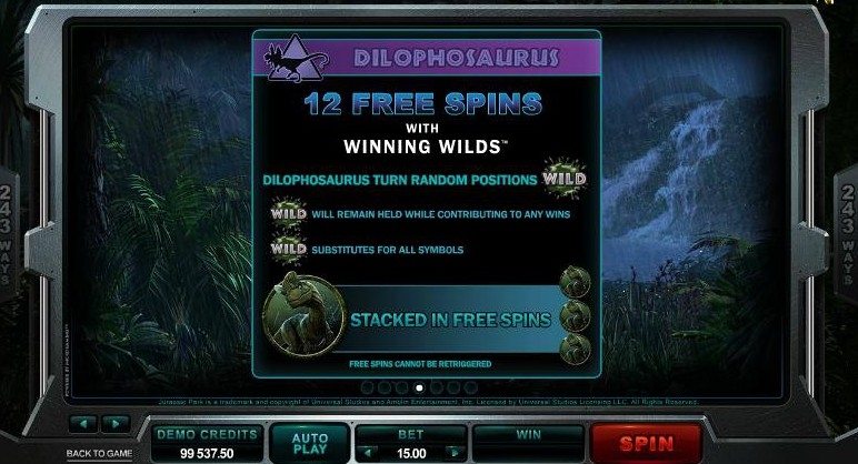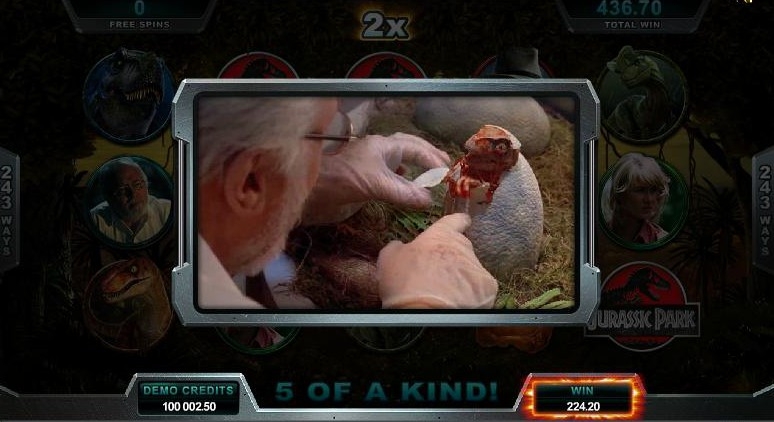 Игровой автомат с раскладкой 5x3 имеет 243 линии выплат. Звуковые эффекты и графика игрового автомата создают ощущение эскапизма и прекрасно погружают в атмосферу фильма. Про динозавров сняли много разных фильмов, но Jurassic Park выделяется на их фоне. Он заслуженно стал культовым фильмом и получил, если помните, несколько премий американской киноакадемии. Игровые слоты подхватили эстафету, правда призы им выдаёт Global Gaming Awards. Динозавры в Парке Юрского периода выглядят реалистично, а Ти-Рекс может и сейчас напугать многих, несмотря на то, что фильм снят более двух десятков лет тому назад. Над фильмом в свое время работали сильнейшие специалисты «Industrial Light & Magic», так что неудивительно, что спустя столько лет, их изображения до сих пор используются в игровом автомате. Скрупулезная работа специалистов над фильмом теперь еще дополнена скрупулезной работой разработчиков игрового автомата, которые создали продукт, в котором и графические, и звуковые элементы прекрасно сочетаются.