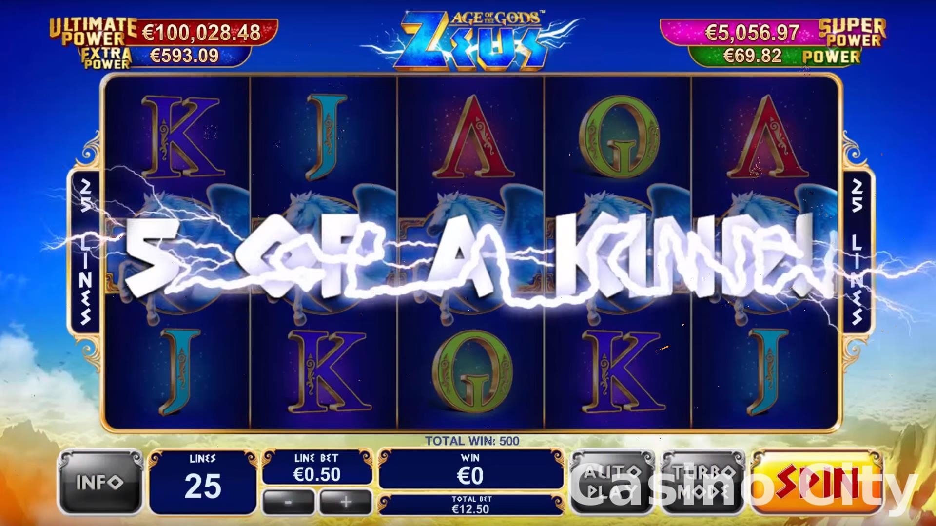 В игре четыре прогрессивных джекпота (Power, ExtraPower, SuperPowerи UltimatePower), которые разыгрываются в случайном порядке при попадании на специальную игру. На поле из двадцати квадратов спрятаны сокровища, сравнимые по ценности со всеми богатствами Олимпа. Вы сможете их забрать при условии, что Зевс благоволит к вам и позволит собрать три одинаковых символа определенного джекпота. В игре предусмотрен турборежим, значит, барабаны будут вращаться намного быстрее.