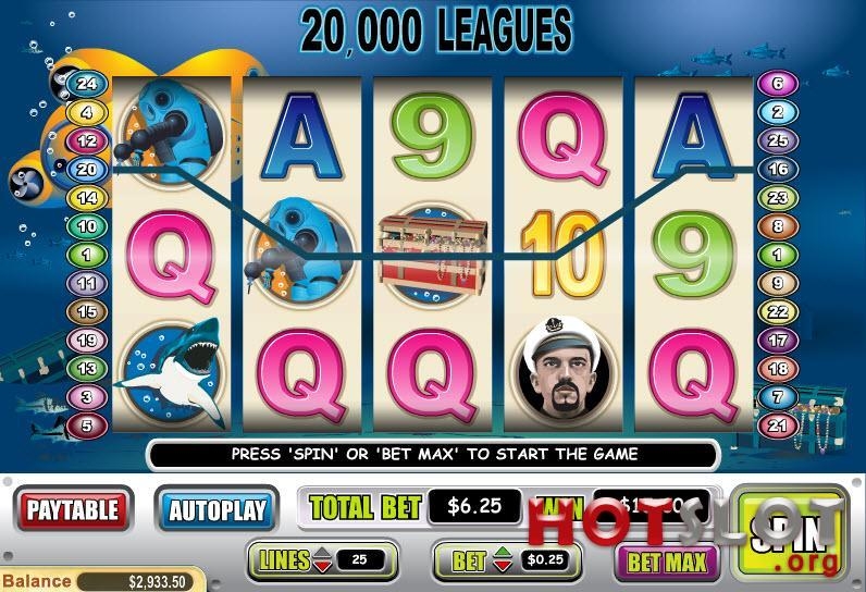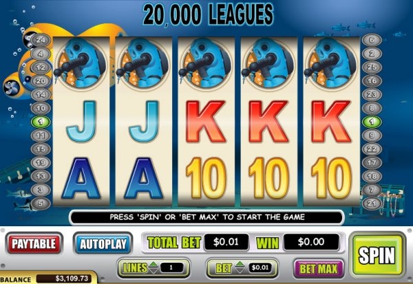 Еще один увлекательный видео-слот от компании CryptoLogic был отмечен игроками. Его название 20 000 Leagues, он содержит пять барабанов и девять линий. Сюжет автомата основан на легендарном произведении Жюля Верна. Поклонники «20 000 лье под водой» оценят тематическое оформление и точность передаваемых изображений игрового автомата. Помимо стандартных символов казино 9, 10, J, Q, K, A, видео-слот содержит дополнительные символыКапитана Немо, акулы, водолаза и сундука с сокровищами.