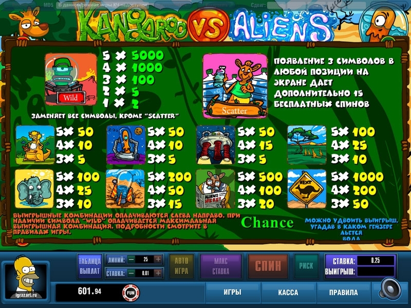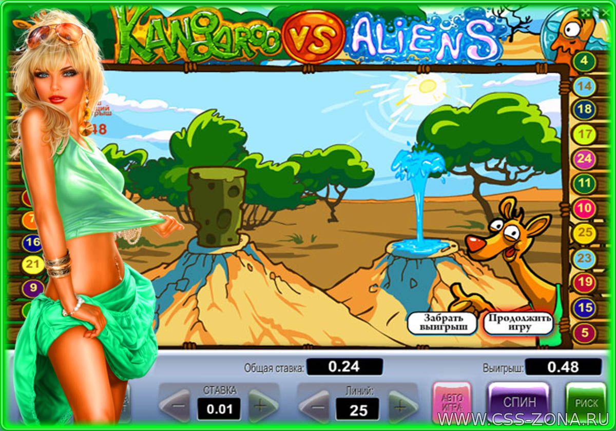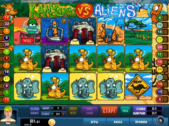 Слот «Кенгуру против пришельцев» также предложит своим игрокам игру по равным шансам. Чтобы увеличить выигрыш за игру придется отправиться на поиски воды.