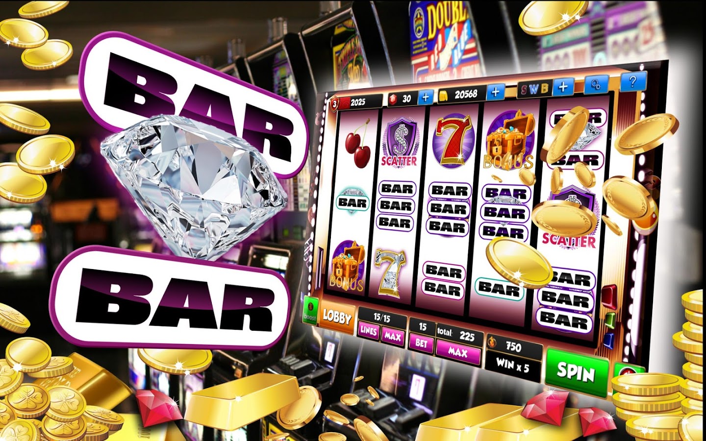 В обычных слотах, к примеру, в слоте Hot Hot 777 с символами "Bar" и семерками, есть три барабана с символами, между которыми можно увидеть пропуски.