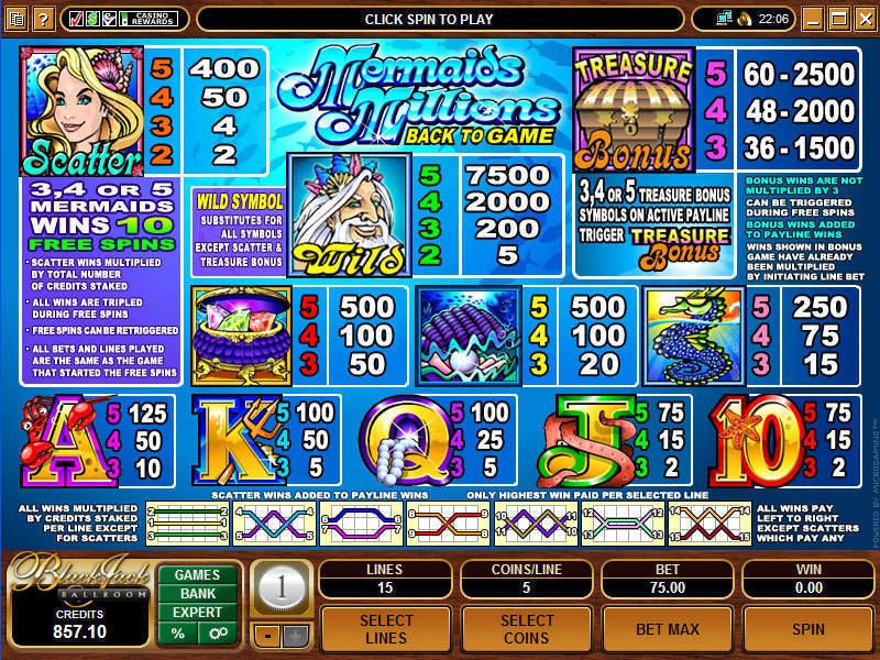 «Mermaids Millions» предложит вам пятнадцать выигрышных линий, которые будут формироваться на поле, состоящем из пяти барабанов.