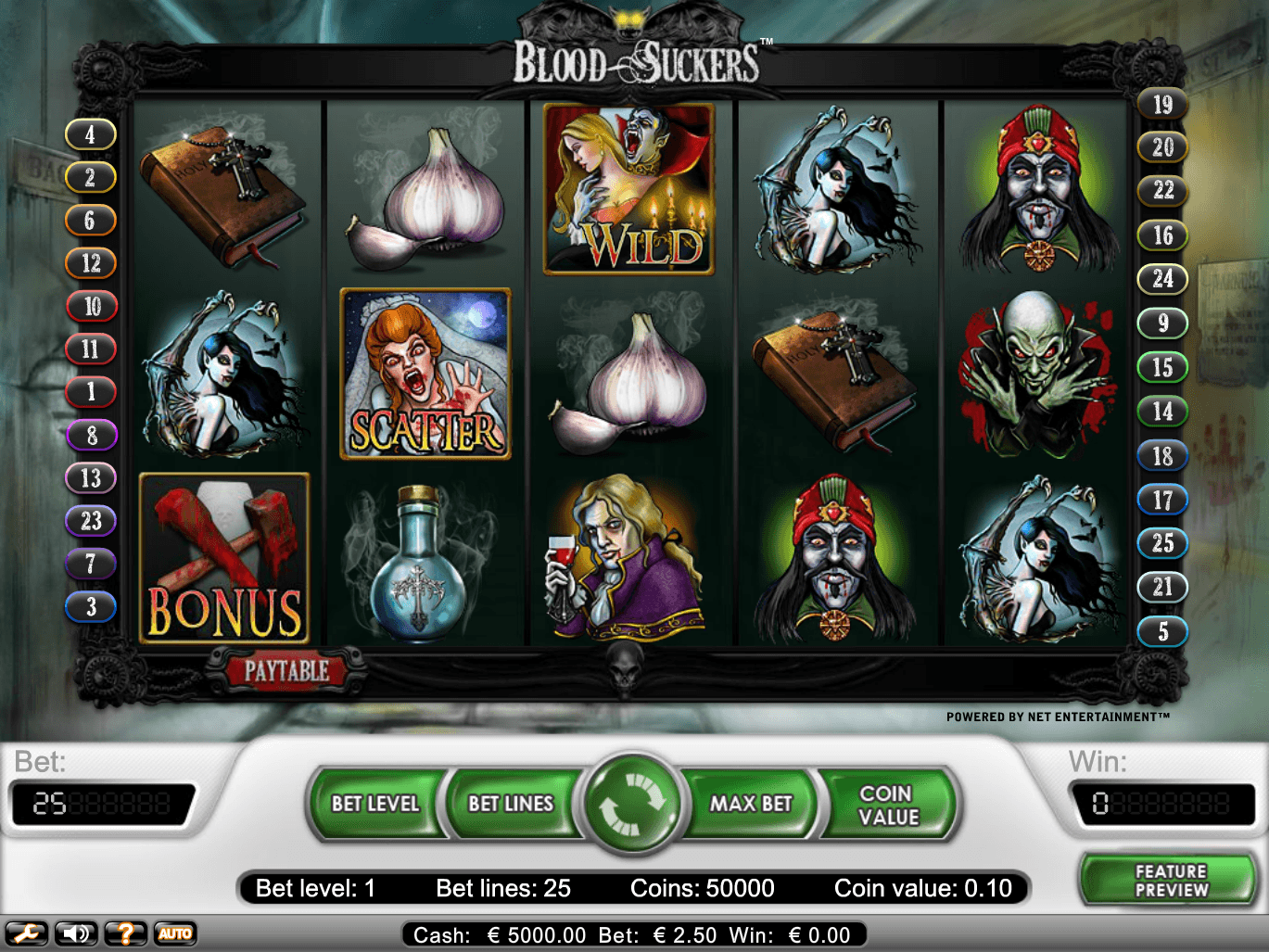 Однорукий бандит «Blood Suckers», посвященный кровососам и приносящий прекрасный доход, уже в настоящее время широкодоступен в большом количестве онлайн-казино.