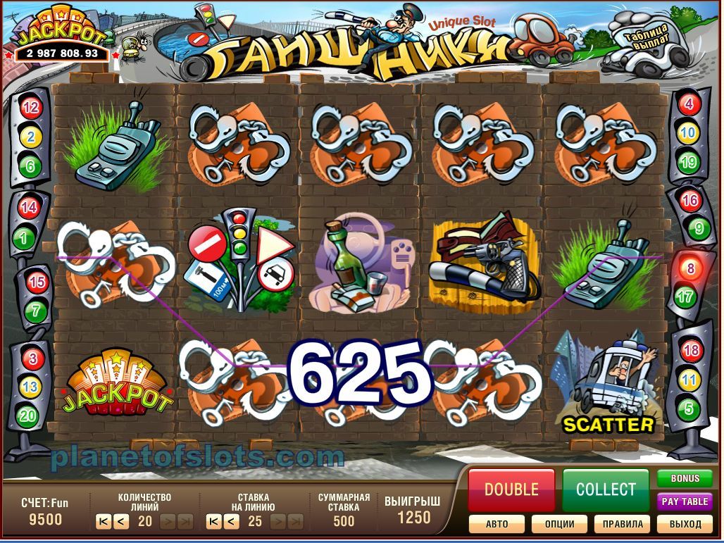 Слоты "Гаишники" сводятся к простому, прогрессивному, бонусному, уникальному, аркадному слоту и мегаслоту. Все игровые автоматы состоят из 5 барабанов и 20 (или 40) линий выплат.