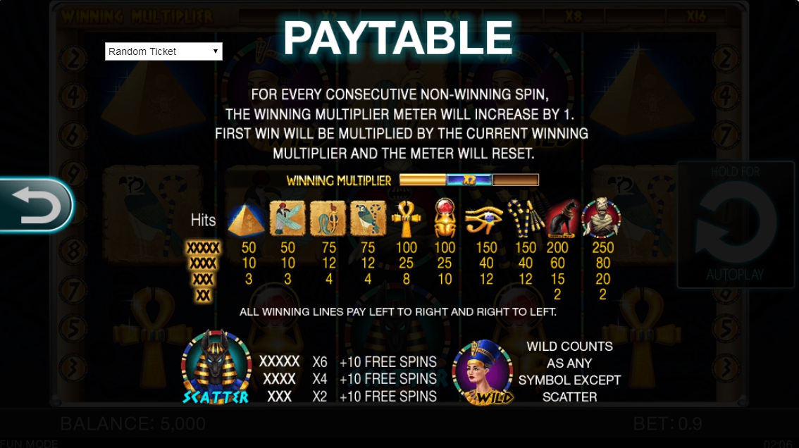 Клеопатра может заменить любой другой символ, которого не достает для формирования выигрышной комбинации (правда, кроме головы Анубиса, который выполняет роль скаттера).