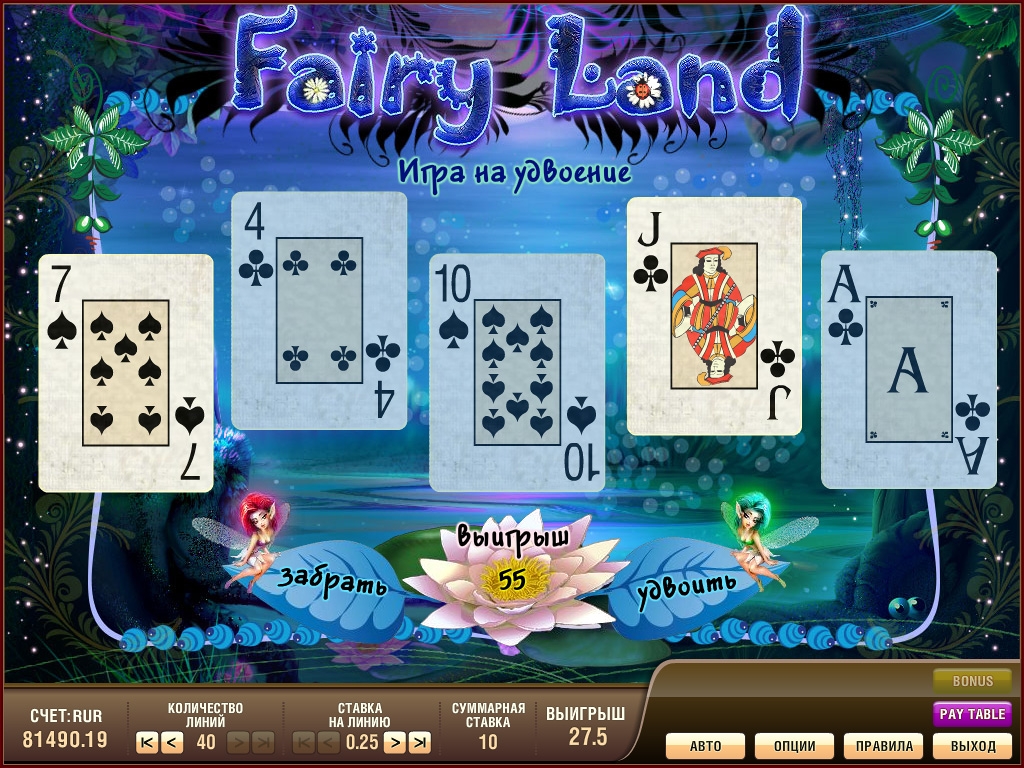 Так, вы можете получить всего 100 монет, а можете и до 250 (комбинации с семерками). Если фортуна была к вам благосклонна и у вас выпала комбинация, состоящая из пяти логотипов игры Фэйри Лэнд, то вы получаете самый крупный джекпот размером 10 тысяч начальных ставок.
