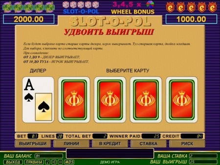 Еще одна отличительная черта слота Слот-о-пол в том, что у него не одна, а несколько бонусных игр. Чтобы активировалась первая игра, нужно получить на линии комбинацию из пяти "игральных костей". Если вам посчастливилось собрать такую последовательность символов, вы получаете выигрыш размером вашей начальной ставки на одну линию, умноженной на 500.