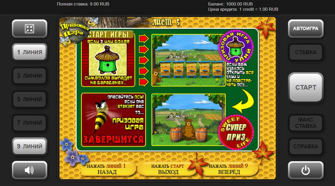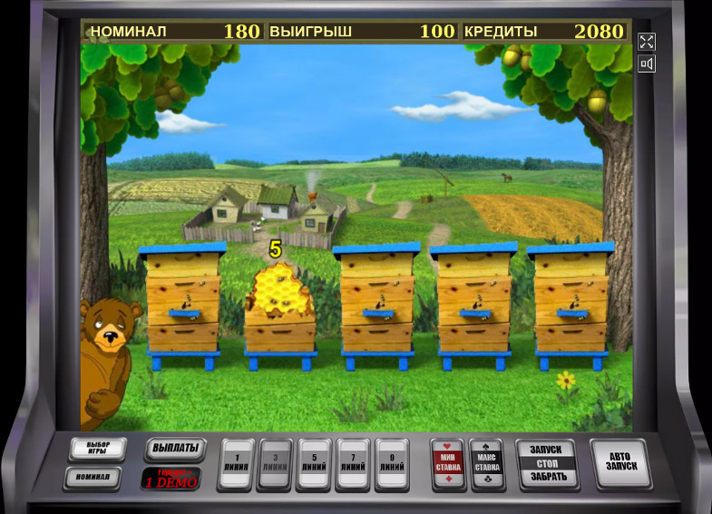 Если не повезло, то медведь попадет под раздачу и будет искусан пчелами, на этом игра закончится и весь выигрыш пропадет. А если удача была на вашей стороне, и стороне медведя, и в гнезде оказался сладкий мед, то выигрыш увеличится вдвое. Интересно, что в эту игру можно играть бесконечное количество раз, пока позволяет размер кредита.