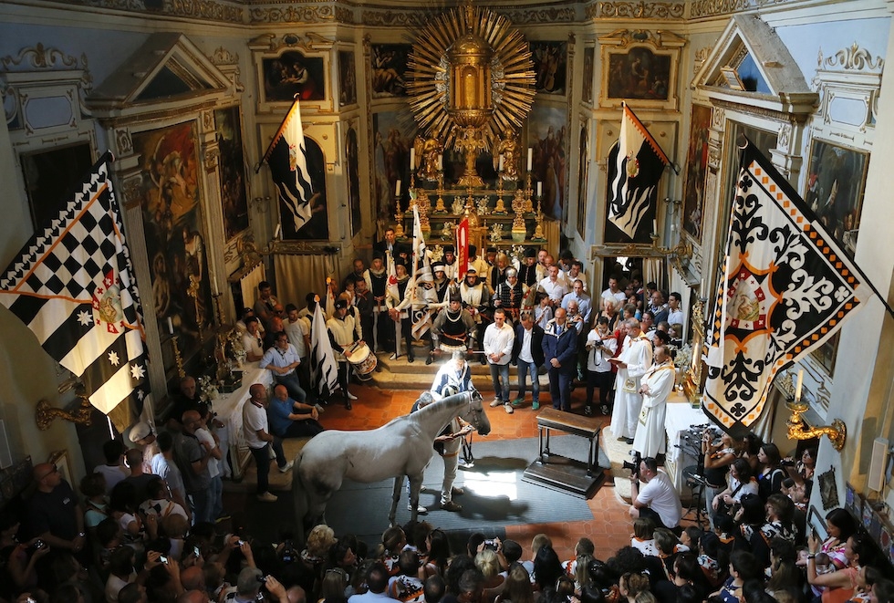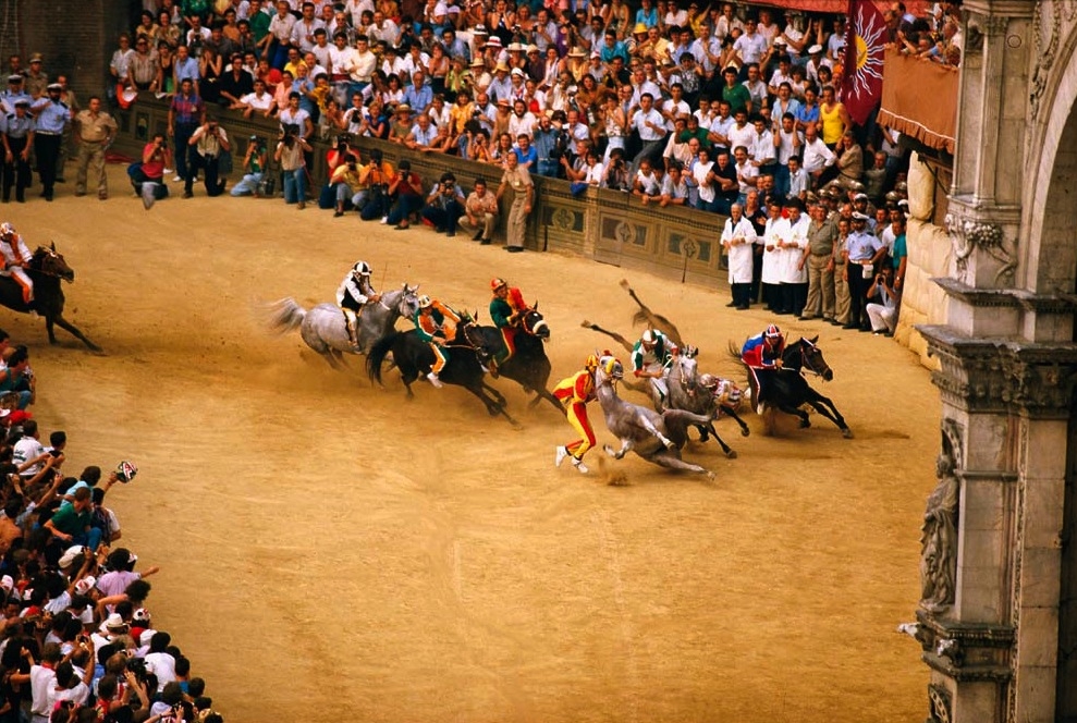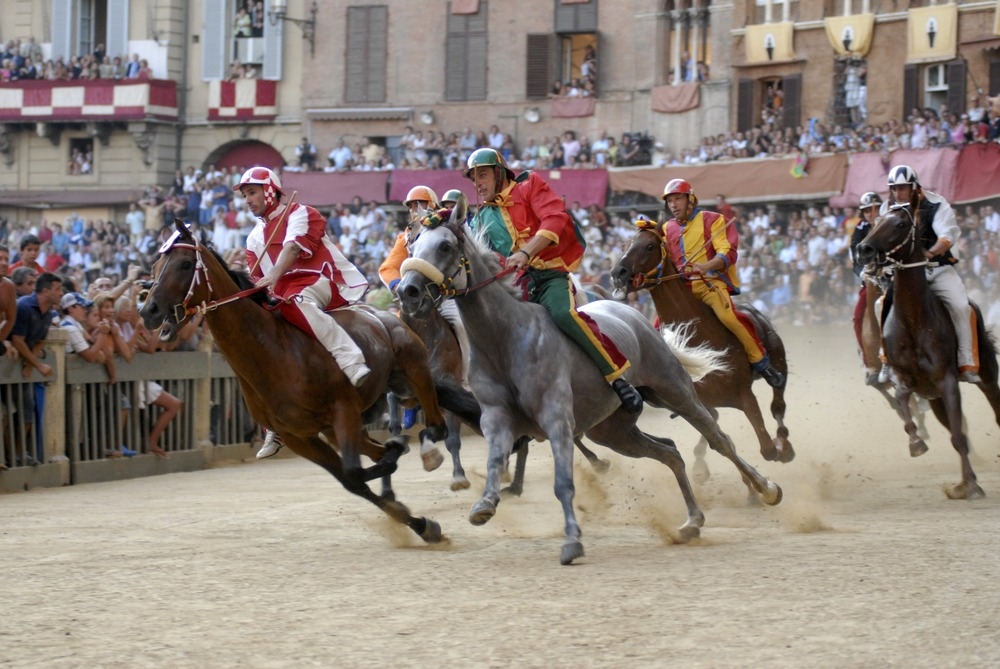 Основной приз данного состязания – шелковое знамя «Палио». За него соревнуются разные старинные районы города. У каждого района есть свой девиз, герб, флаг, а также свои цвета. У каждого из кварталов имеется свой храм. Сами скачки проходят очень быстро и заканчиваются через 1,5 минуты. А вот подготовка к ним – долгая и скрупулезная. Участники готовят костюмы, репетируют церемонию шествия. Кроме того, идет разработка стратегии поведения жокея и лошади во время скачек. Размер дистанции – один километр. На площади Кампо один километр равен 3 кругам по периметру. Покрытие площади специально привозят к данному событию, иначе лошади повредили бы копыта.