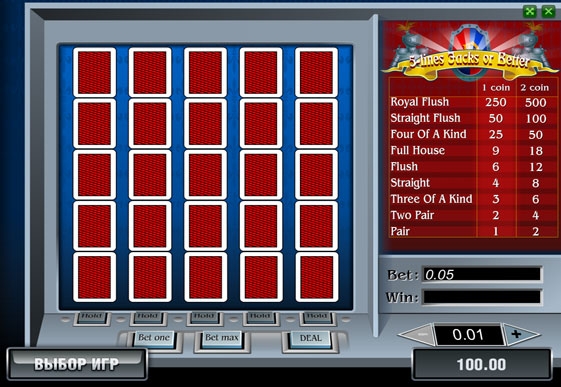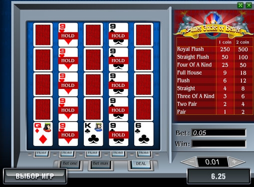 Главное отличие этого игрового автомата от классических аппаратов заключается в том, что играть здесь можно одновременно на пять рук. Из-за такой специфики интерфейс автомата «Валеты или выше, пять линий» выполнен немножко не традиционно. Пять рядов карт находятся в левой части экрана, там же можно увидеть и таблицу выплат с информацией о всех возможных оплачиваемых комбинациях. Два индикатора «Bet» и «Win» отображают соответственно суммы текущей ставки и выигрыша в предыдущем раунде. Карты фиксируются кнопками «Hold».