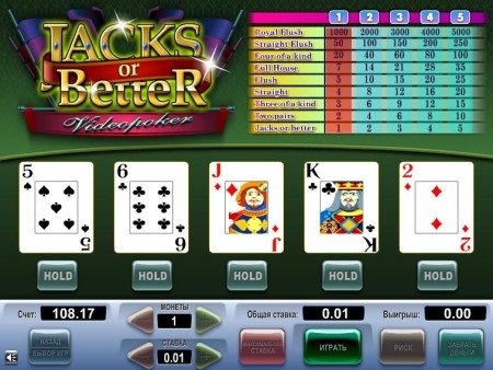 Ни для кого не является секретом, что видео покер – это «автоматизированное» воссоздание традиционного покера. То есть на мониторе появляется пять карт, и Вы самостоятельно решаете, какие из них следует оставить, а какие обменять. Так, Вы будете стараться собрать максимально сильную 5-карточную комбинацию. Также не забывайте, что под каждой картой на мониторе размещена кнопка, посредством которой можно оставлять или менять карты. А таблица выплат находится в верхнем углу экрана.