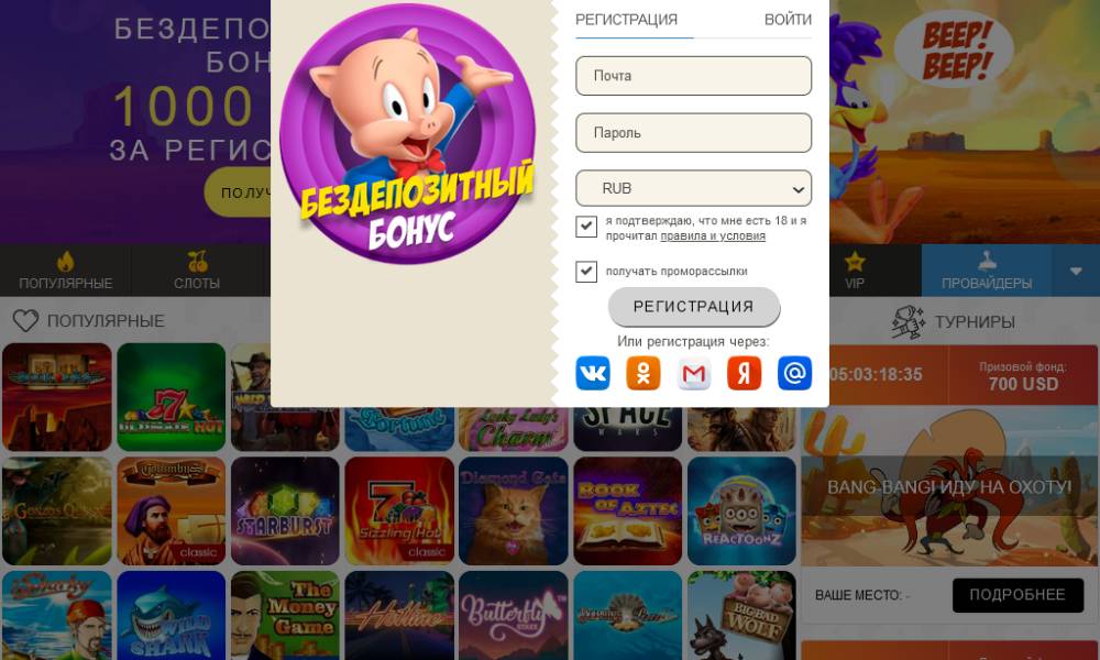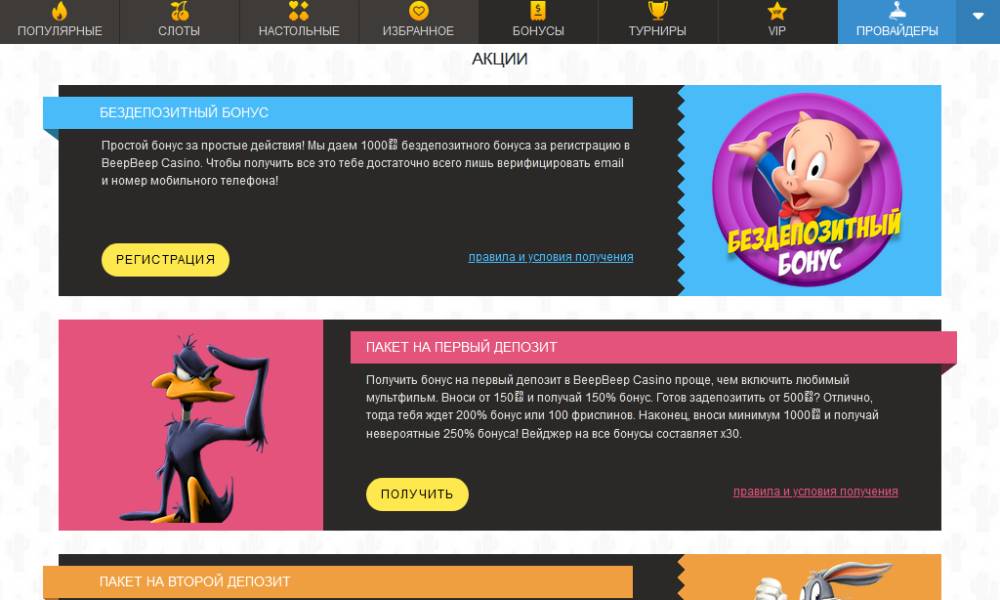 Новички получают бездепозитный бонус Beep Beep за регистрацию. Условия акции рассматриваются ниже в обзоре.