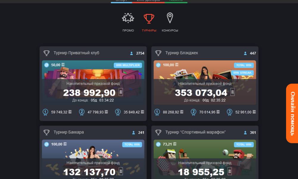 Если вы любите не просто играть в азартные игры, но также состязаться с другими клиентами, претендуя на часть призового фонда, принимайте участие в регулярных и разовых турнирах онлайн-казино Бонс. Их расписание и правила участия публикуются в тематическом подразделе. Обычно это бесплатные слот-турниры с заманчивыми призами разных видов.