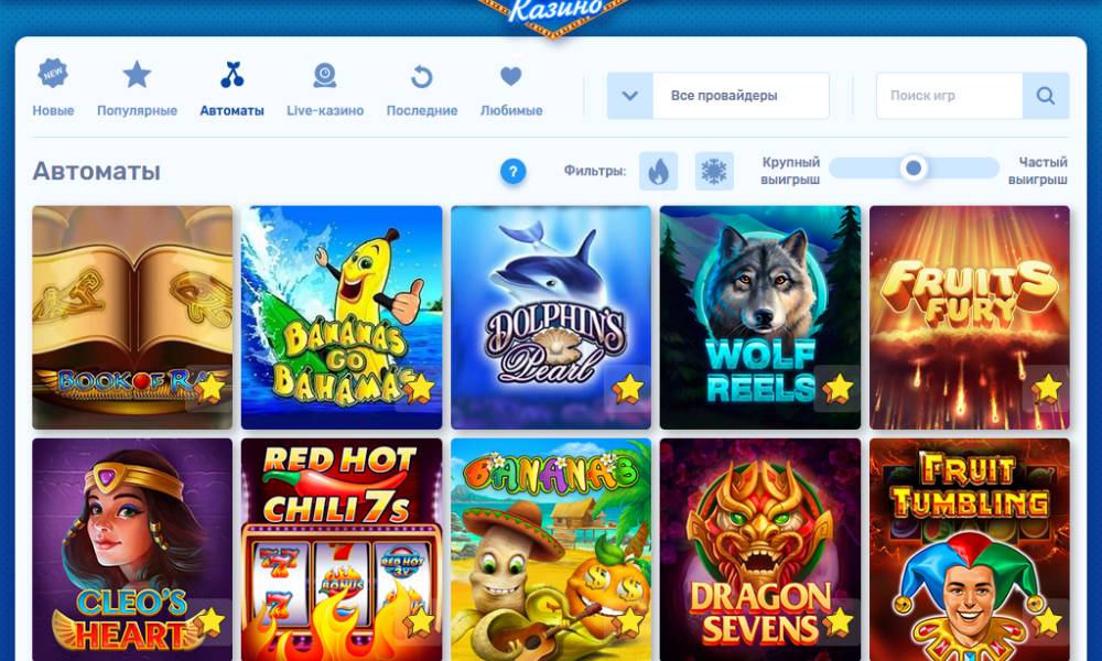 Дополнительно можно отсортировать игры по провайдеру или воспользоваться другими фильтрами. Например, есть опции «горячие» и «холодные» слоты, а также ползунок отбора по волатильности (от «крупных выигрышей» до «частых выигрышей).
