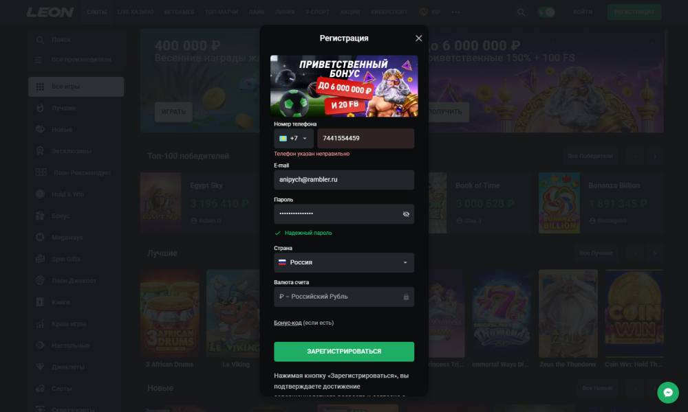 Если вы еще не зарегистрированы в казино Леон, необходимо создать аккаунт: