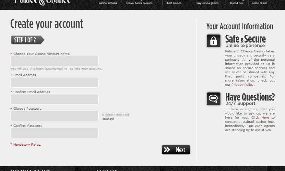 Процесс создания аккаунта в Palace of Chance стандартный и понятный.