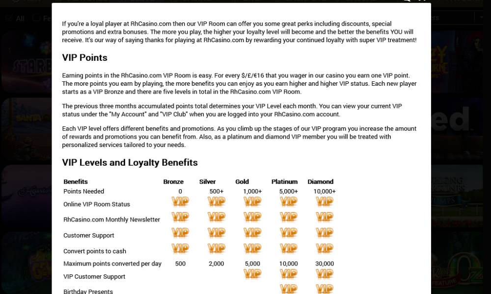 В VIP-клубе действует система уровней от бронзового до бриллиантового. Статусы присваиваются по количеству накопленных баллов. Очки присуждаются за ставки настоящими деньгами. Собранные пойнты можно также менять на деньги.