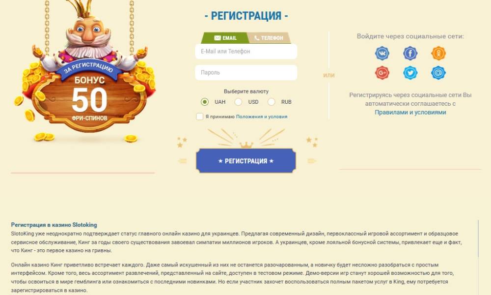 Сразу хотим предупредить наших читателей, чтобы они не путали заведение, рассматриваемое в обзоре, с King Casino, работающем на платформе Playtech. Обсуждаемый здесь портал позиционирует себя как первое украинское онлайн-казино и работает по адресу slotoking.com. Его достоинства и недостатки рассматриваются ниже. Сразу скажем, что русскоязычные пользователи будут чувствовать себя здесь более чем комфортно.