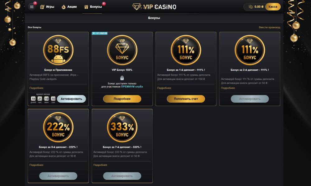 Бездепозитный бонус за регистрацию в интернет-казино ВИП не предоставляется. О стартовом пакете для новичков читайте ниже.