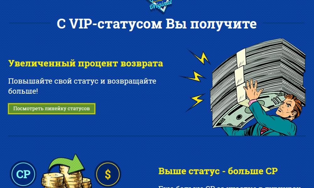 VIP программа Вулкан Оригинал состоит из четырнадцати уровней. Они присваиваются по количеству баллов, набранных за ставки деньгами в разных играх казино.