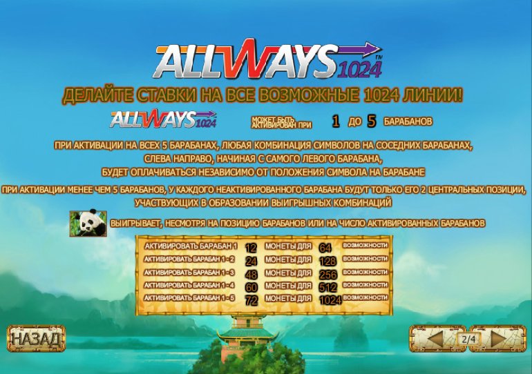 Если же AllWays не задействована для каких-то из последних барабанов, на них будут учитываться лишь две центральные позиции для образования выигрышных цепочек. В зависимости от количества активированных колонок меняется количество возможных комбинаций: 64, 128, 256, 512 или 1024.