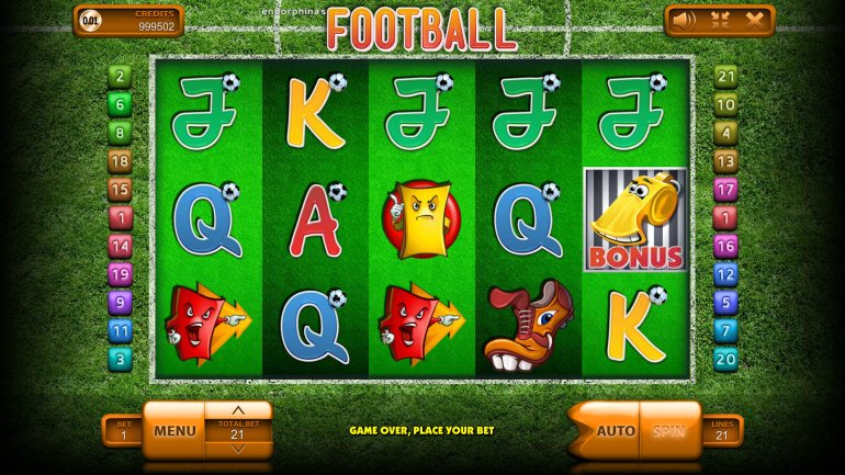 Эту игру с незамысловатым названием предлагает компания Endorphina. Главным достоинством слота нам показались веселые персонажи. Его героями стали одушевленные предметы футбольной экипировки: желтые и красные карточки, бутсы, свистки и так далее.