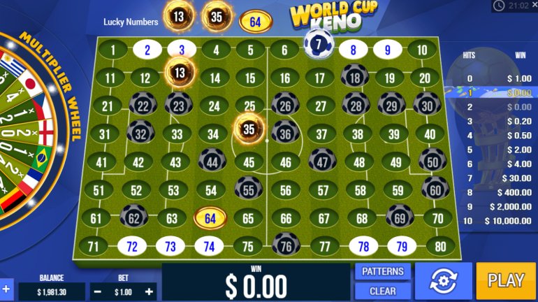 World Cup Keno стилизована под поле для футбола, по котором разбросаны шары, пронумерованные по порядку. Вы можете выбрать от одного до десяти чисел, но рекомендуется всегда указывать десять номеров, потому что лишь в таком случае можно стать участником призового розыгрыша.