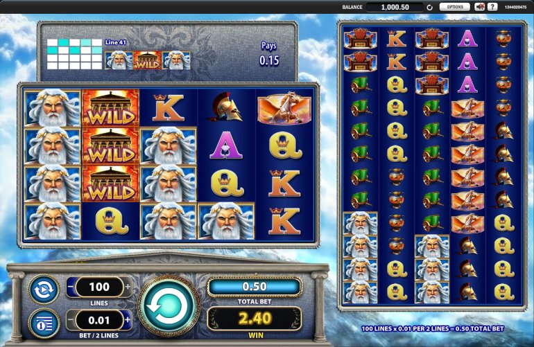 В Zeus 1000 два экрана с пятью барабанами на каждом из них. На первом помещается двадцать символов, а на втором – шестьдесят. Можно задействовать до ста полос. Так как изображения идут стеками, комбинаций здесь очень много. Есть также особые символы, фри-спины и другие дополнительные функции.