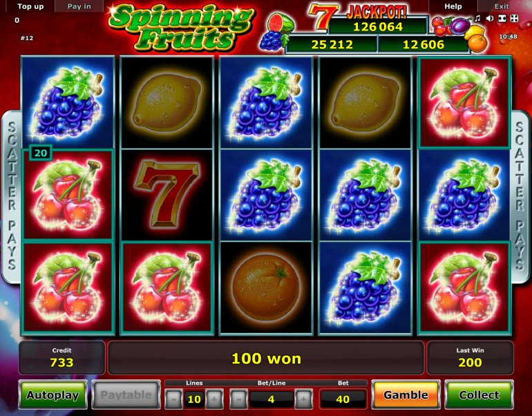 Чтобы получить джекпот в «Ультра-фруктах», необходимо залить все пятнадцать ячеек на экране одинаковыми картинками. Наивысшим достижением будут пятнадцать семерок, которые принесут вам максимальный выигрыш. Также можно получить 5%, 10% или 25% всех собранных денег. Еще раз напомним о важности размера ставки.