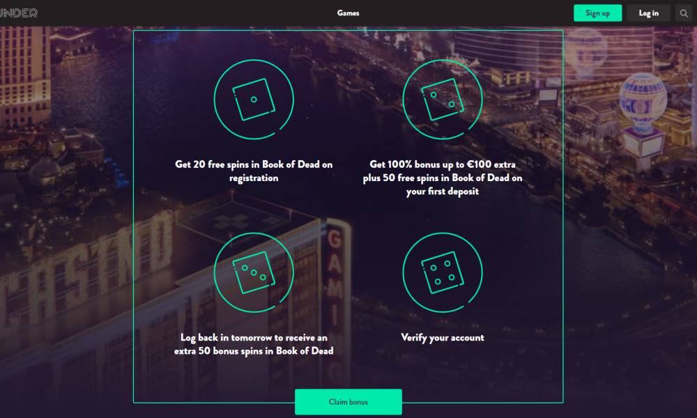 Новые игроки Dunder Casino имеют возможность получить 100 фриспинов за первый депозит. Вращения предназначены для слота Book of Dead и должны быть использованы в течение 24 часов после активации. Выигрыши со спинов нужно отыграть за 30 дней с вейджером х30.